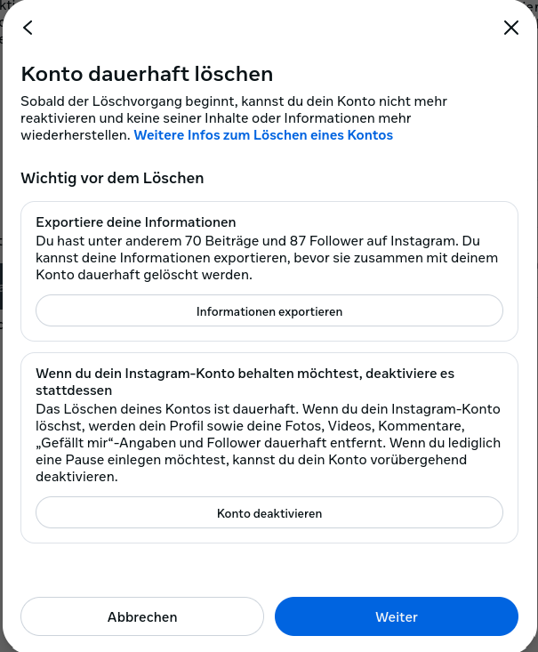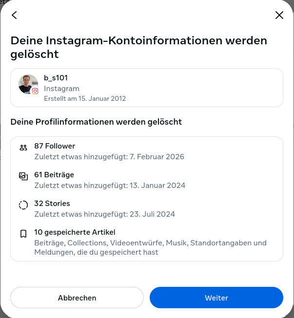 Ich habe mich entschlossen, meinen Meta Account (Facebook und Instagram) zu löschen. Genutzt habe ich die Accounts schon länger nicht mehr. In der Vergangenheit habe ich die zugehörigen Apps mal installiert und wieder deinstalliert.