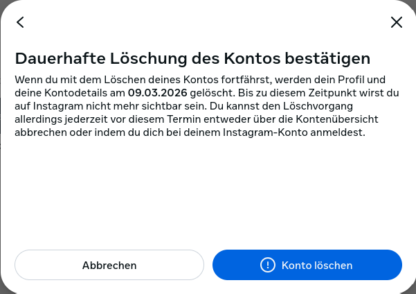Leider wird es einem nicht einfach gemacht, das eigene Konto zu löschen. Daher habe ich die Schritte hier dokumentiert (Stand: 07.02.2026). Achtung: startet den Löschvorgang aus dem jeweiligen Dienst heraus. Facebook über Facebook und Instagram über Instagram, da der Löschvorgang ansonsten fehlschlägt, falls ihr eine 2-Faktor-Authentifizierung eingerichtet habt.